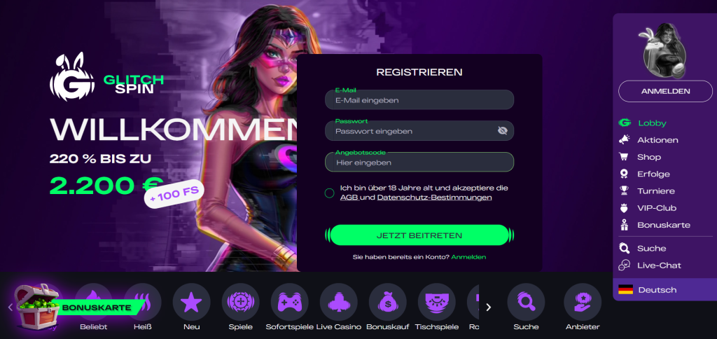 GlitchSpin positioniert sich als bonusorientierte Plattform mit starkem Fokus auf Promotionen und Community-Features. Das mehrstufige Einzahlungsbonussystem bietet insgesamt vier Bonusstufen: vom Standard-Willkommensbonus (100% bis 500€) über eine High-Roller-Option (50% bis 1.000€ + 100 FS) bis zu zweiten und dritten Einzahlungsboni. Das Hauptbanner zeigt 220% bis zu 2.200€ + 100 FS.