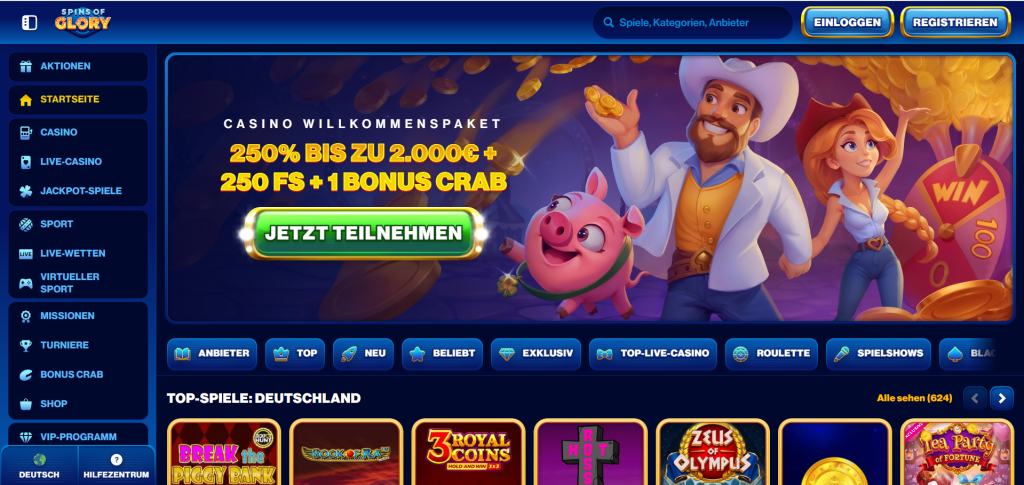 Spins of Glory kombiniert Sportwetten und Casino auf einer Plattform und hebt sich durch ein ungewöhnliches Gamification-Konzept ab: Das Bonus-Crab-System vergibt Punkte für aktive Spielteilnahme, die gegen Wettguthaben oder live casino spiele-Freispiele eingetauscht werden können. Im Wettbereich lagen die Quoten im Test 3–5% über dem Marktniveau — ein messbarer Vorteil für regelmäßige Sportwetter.