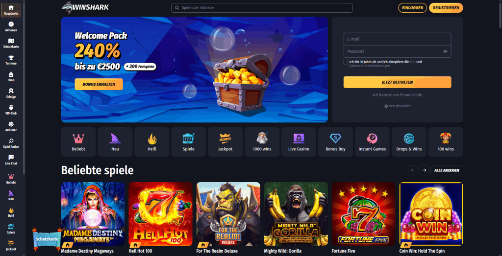 Das VIP-Programm mit fünf Stufen bietet einen eigenen Bonus-Shop, in dem Freispiele und Bargeld gegen gesammelte Münzen eingetauscht werden können. Wöchentliche Aktionen — Mittwochs-Bonus (40% bis 250€) und Cyber-Wochenendbonus (50% Reload) — sorgen für kontinuierliche Anreize. Bitcoin-Auszahlungen erfolgen sofort und gebührenfrei. Sicherheitstechnisch setzt WinShark auf SSL-Verschlüsselung und Zwei-Faktor-Authentifizierung.